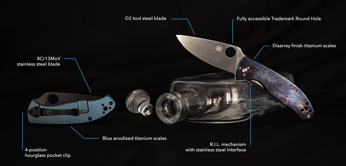 In addition to the “standard” expressions of the Tenacious R.I.L., this remarkable design is also available in an “upscale” version featuring a premium D2 tool steel blade and a stunning “Disarray” finish on the handle scales. This proprietary heat-based anodizing process is individually applied to the polished titanium scales to create a breathtaking lightning-bolt-like pattern. Completely random and unique to every scale, this finish—and the enhanced blade steel—take the Tenacious to all-new levels of sophistication. The Tenacious R.I.L. Disarray finish is also available with a choice of a satin-finished blade and bright hardware or a black-oxide-coated blade and matching black-coated hardware.